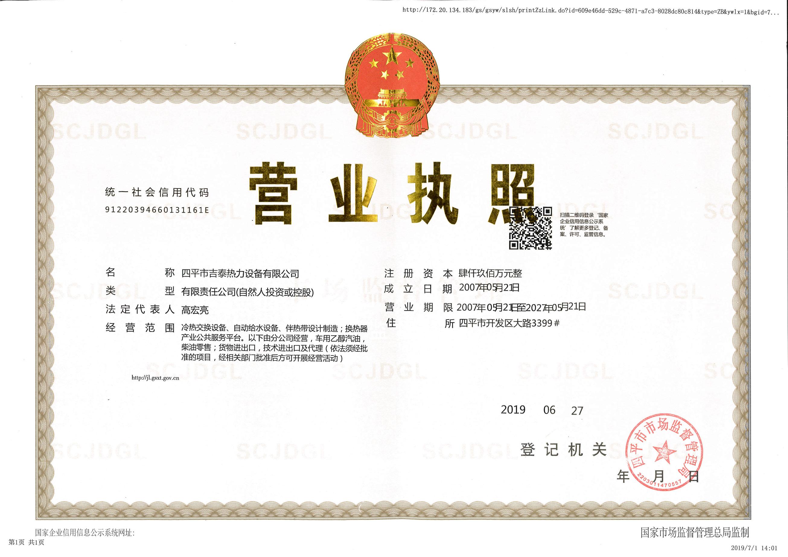 • SIPING JITAI HEAT EXCHANGE EQUIPMENT CO.,LTD. 四平市吉泰熱力設(shè)備有限公司
